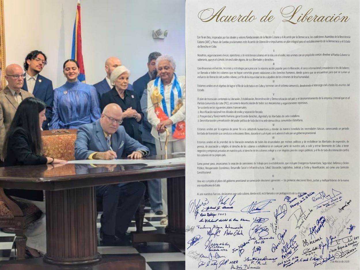 Organizaciones del exilio y la oposición cubana presentaron este lunes 2 de marzo de 2026 en Miami el Acuerdo de Liberación, documento político que propone una hoja de ruta para la transición democrática en la isla y el restablecimiento del Estado de Derecho una vez que se consiga, según establece el punto cuatro del texto:
